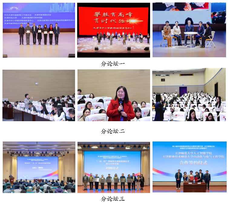 在分论坛环节,分论坛一以“数智时代的基础教育教师队伍建设”为主题,通过专家报告、教师教育培训规划汇报、教师培训重点项目结业活动等形式,展现了师资队伍分层分类进阶式培养取得的显著成效。分论坛二以“数智时代的基础教育课程教学变革”为主题,专家报告精准回应了数智时代课程教学变革的核心关切,通过理论思辨与实践案例的碰撞,为构建兼具数字智慧与人文关怀的未来教育图景描绘了清晰的实践路径,为区域教育协同发展提供了学理支撑。分论坛三以“数智时代‘三校一院’协同培养创新型教师”为主题,开展了专家报告、天津师范大学与天津职业技术师范大学相关学院签约仪式、“三校一院”联合实践基地授牌仪式等活动,推动协同育人机制走向实体化、机制化。
