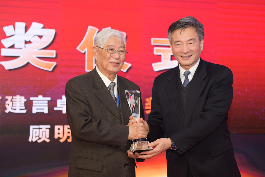 图为罗富和为顾明远颁发长江教育研究院“教育建言卓越贡献奖”